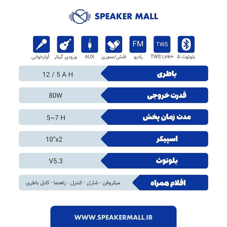 JVC NX518BP خفن ترین رو از دست نده یکی از بهترین و خفن ترین اسپیکر های بازار که انتخابی مطمعن و با کیفیت عالی رو میشه از برند JVC نام برد که برای پارتی ها و مراسمات حتی جشن ها یه انتخاب عالییییههه! اگه دنبال یه اسپیکر قابل حمل هستی که بتونی همه جا ببریش و یا کمپ کنید و هم برق مستقیم باشه و تا ۷ ساعت هم پلی تایم با باطری قویش داشته باشی این تعداد محدود رو از دست نده! این اسپیکر مجدد شارژ نمیشه پس فرصت رو از دست نده امکانات این غول اسپیکرا: باطری: جانبی و برق مستقیم با توان ۵ آمپر قدرت خروجی: ۸۰ وات مدت زمان پخش: نسبت به نوع باطری بین ۵ تا ۷ ساعت بلوتوث: ورژن ۵.۳ فاصله ی انتقال: ۱۰ متر پورت: فلش، مموری، TWS, AUX اقلام همراه: شارژر دو عدد میکروفن دفترچه راهنما باطری کابل اتصال به باطری ماشین جهت می توانید از طریق و یا شماره های ذیل ثبت نمایید: 09014874136 09905649146 www.speakermall.ir