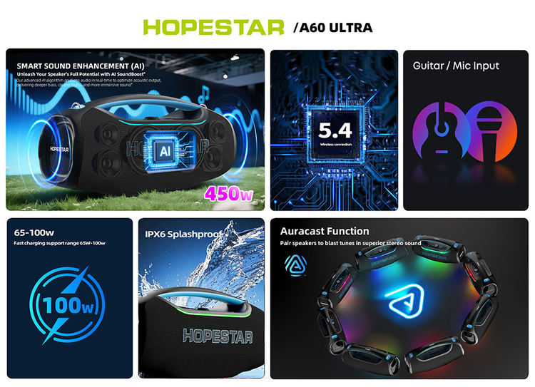 هوپاستار A60 اولترا با تحقیق و توسعه فناوری کاملاً جدید، نوآوری در کیفیت صدا را متحول میکند. این دستگاه دارای جلوه صوتی 24 بیتی، 450 وات، فناوری بهبود جلوه صوتی Al، بلوتوث 5.4 و پشتیبانی از اتصال بیسیم چند دستگاهی از طریق AURACAST است. همچنین دارای تقویتکننده باس قدرتمند با نورپردازی پویای RGB و باتری قابل جدا شدن است. این محصول جدیدترین نسخه 2026 شرکت هوپ استار که میتونه به دو تا 10 اسپیکر دارای سیستم AURACAST وصل بشه .